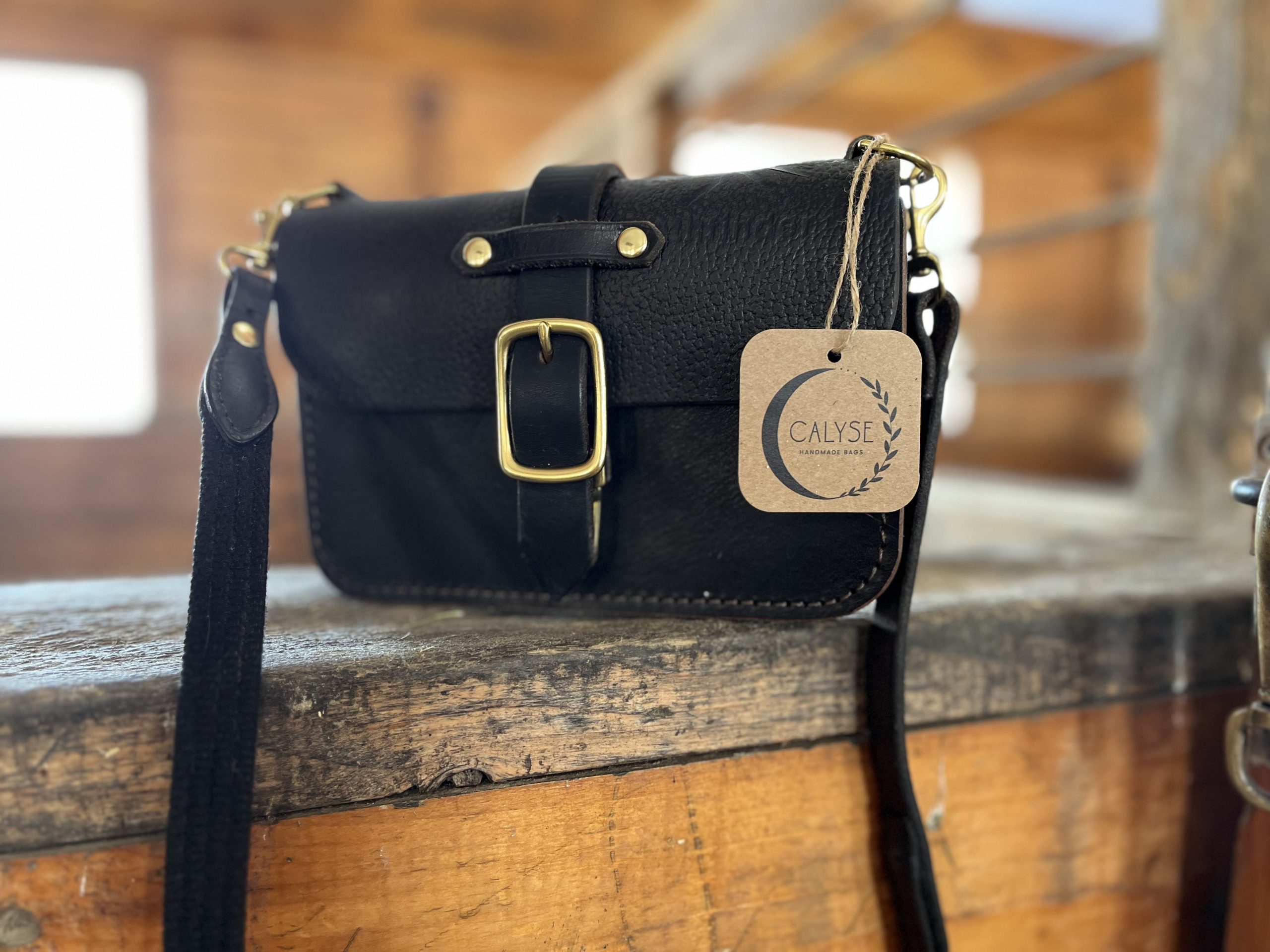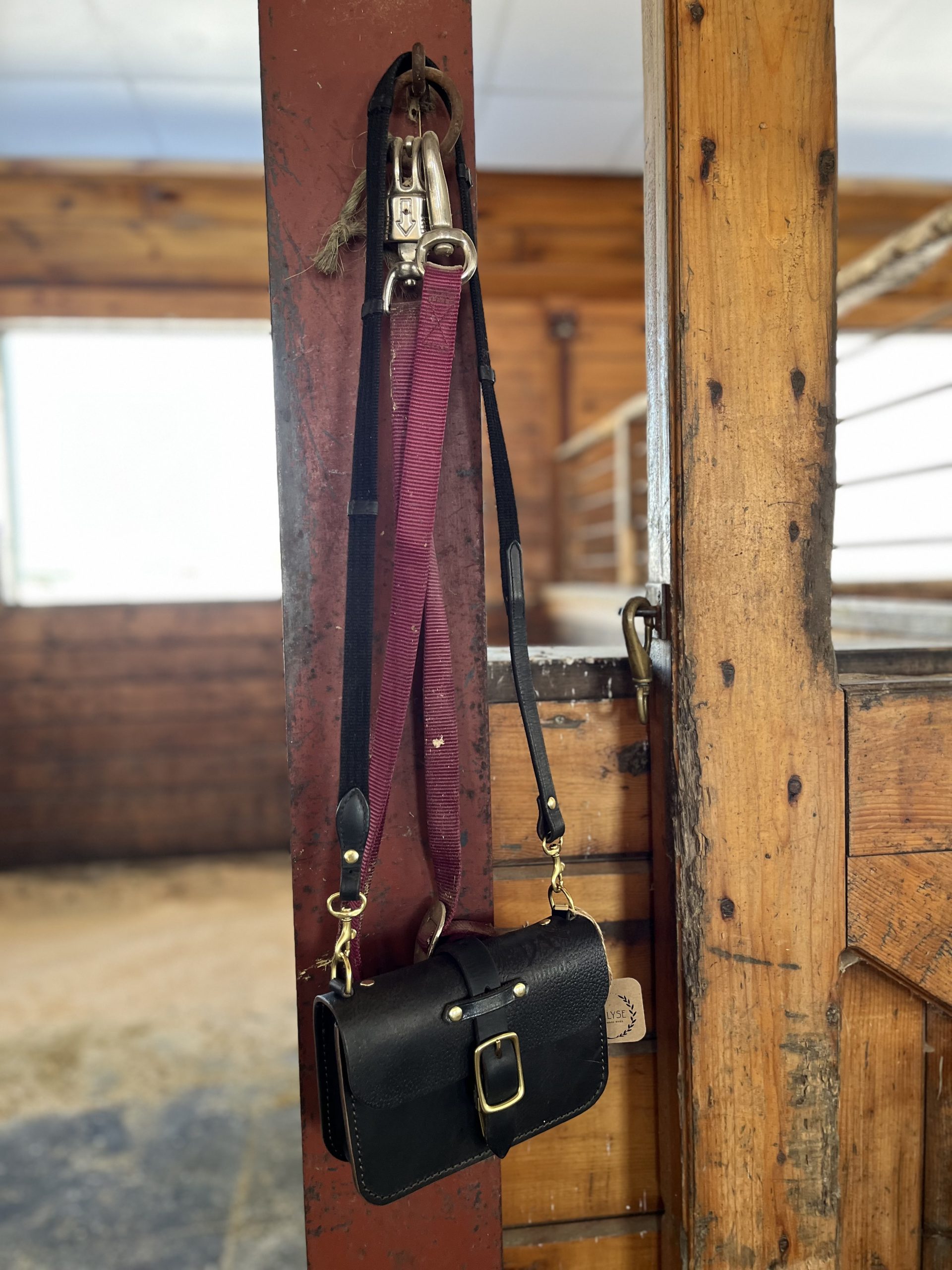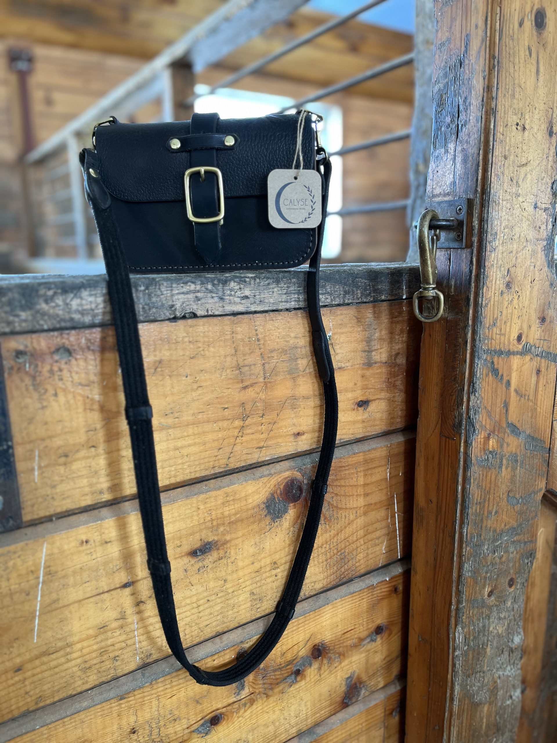 The Saint is a small crossbody bag made from a repurposed vintage saddle. A petite, yet sturdy bag with totally unique character! In fact, this Saint bag has an imprint of a horse resembling a Friesian on it (so appropriate for this year!).