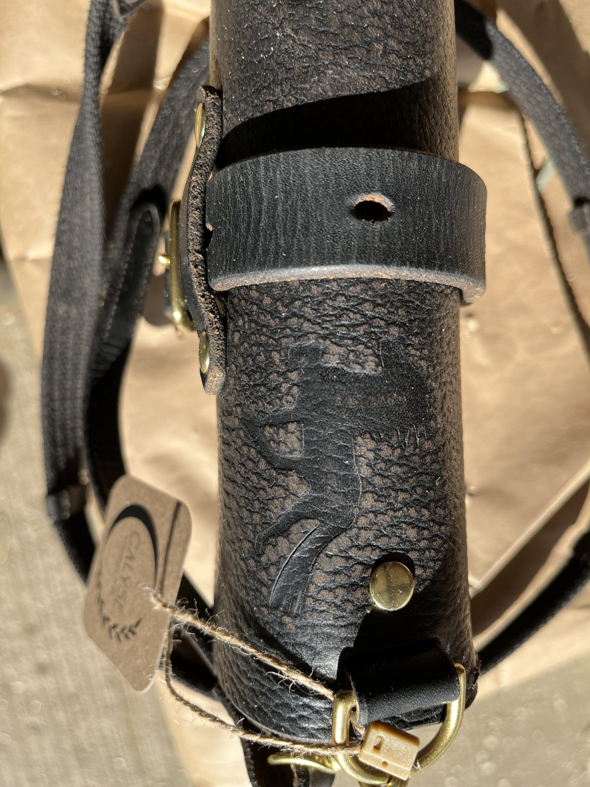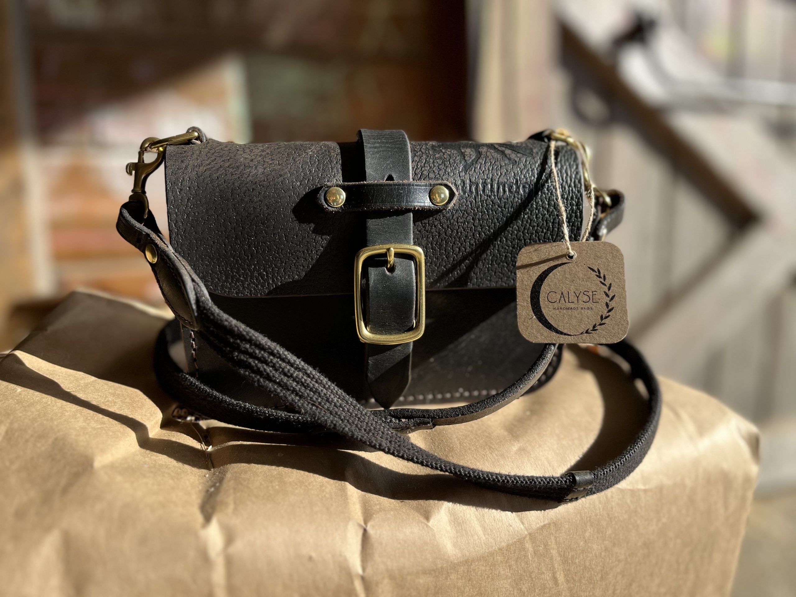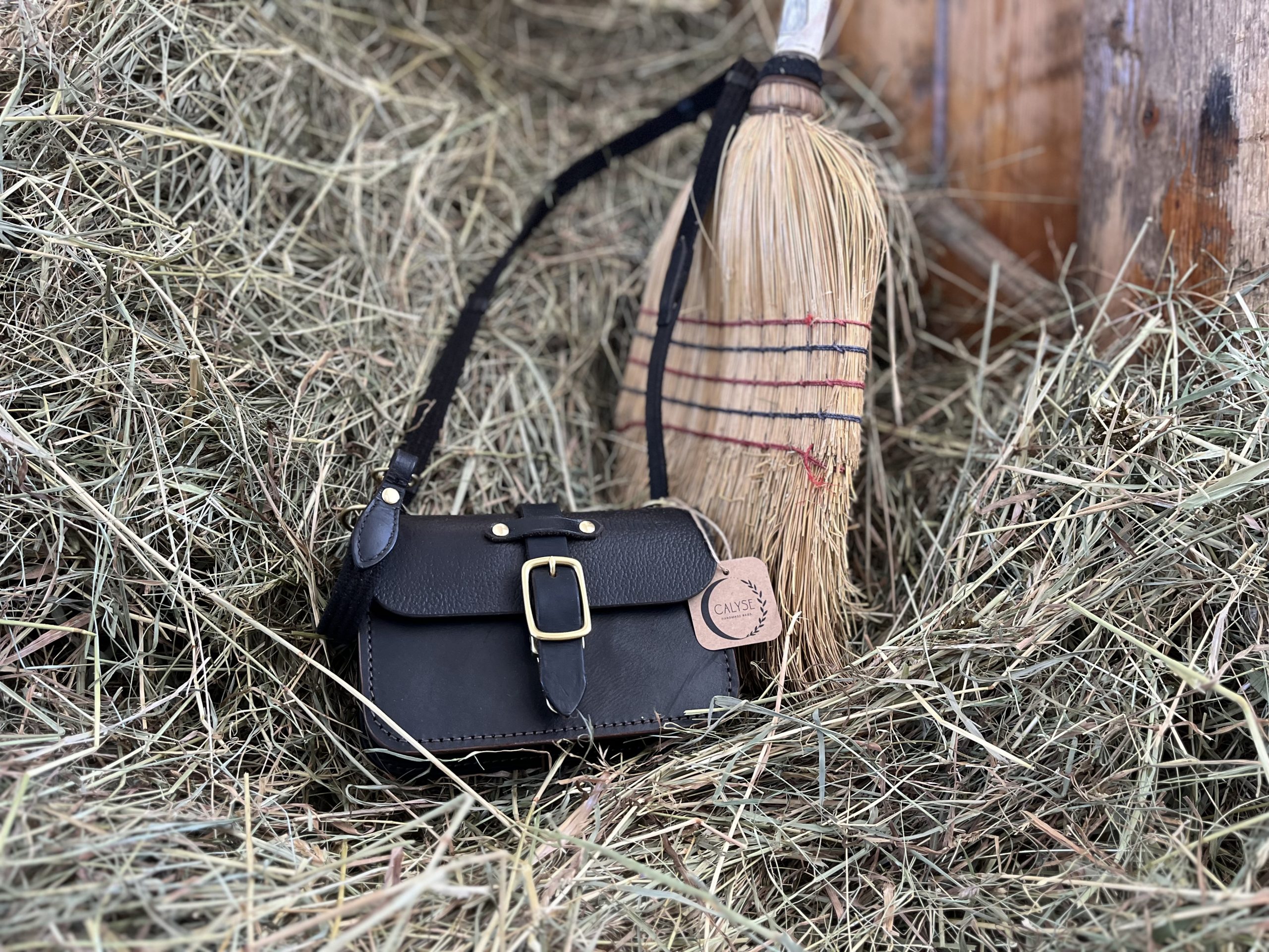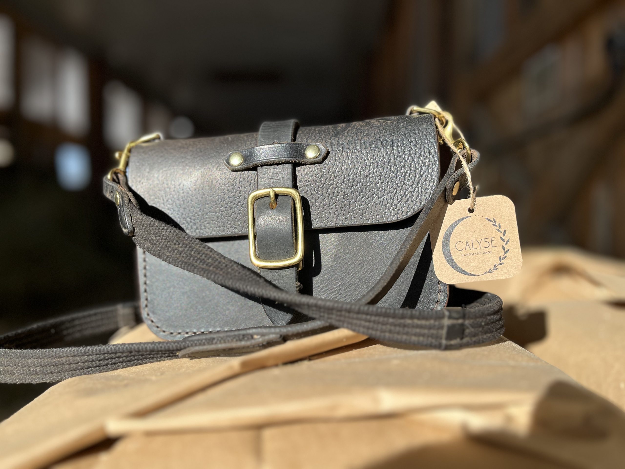 The Saint is a small crossbody bag made from a repurposed vintage saddle. A petite, yet sturdy bag with totally unique character! In fact, this Saint bag has an imprint of a horse resembling a Friesian on it (so appropriate for this year!).