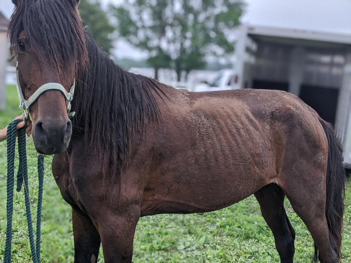 This soft-eyed gelding arrived 100 pounds underweight, with multiple retained teeth, and an open wound concealed beneath his thick forelock.