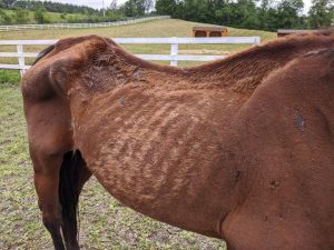 Nearly 200 pounds underweight, covered in rain rot and lice, and with overgrown hooves and sharp teeth, this is one of the most badly neglected horses we have ever seen.