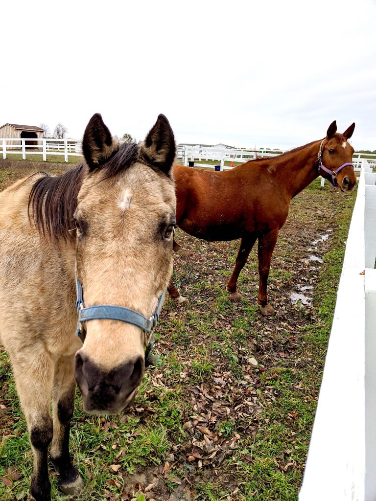 In retirement, Molly spends her days with her new friend Star, sometimes doing a lovely dancing prance when she is excited during turnout. After her working life as a youngster and her neglectful treatment as she grew older, Molly has earned her retirement.