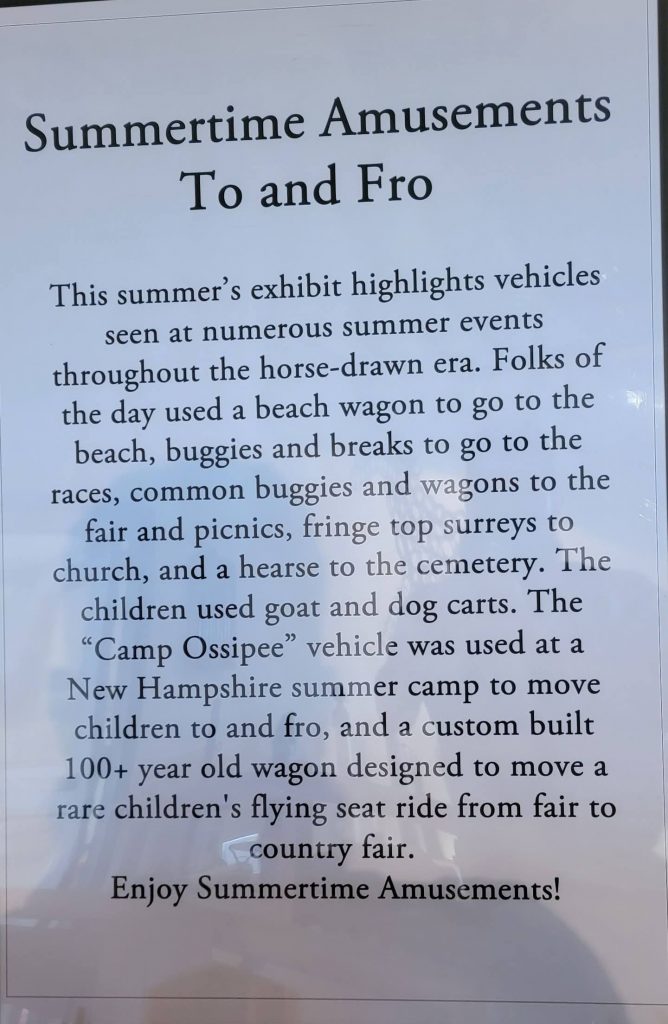 For horse lovers and history lovers alike, the most exciting aspect of Skyline Farm comes to light when you step into the extensive carriage museum. The conveyances shown change twice a year, and the exhibit at the time of writing was called “Summertime Amusements To and Fro,” which showed all sorts of vehicles that would have been used during the summer season. Many other horse-drawn vehicles were on display, including a hearse and an absolutely stunning “school sleigh,” an enclosed sleigh with benches just like a modern school bus!