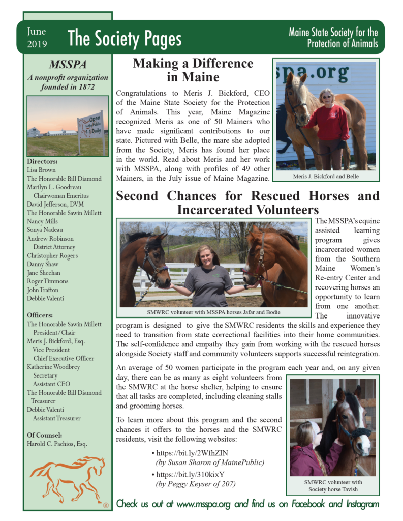 The summer 2019 edition of The Society Pages is chock full of wonderful news and photos. Check it out for adoption updates, news about the latest happenings at New England’s premier horse shelter, and so much more.