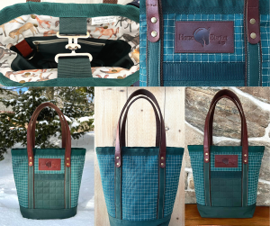 This work of art was created using a used green and white horse blanket from MSSPA for the body of the bag, bottom, and front pocket. Designer fabric depicting various horses lines the inside top third of the bag. Green trim, brown leather handles, an inside zipper pocket, an upcycled clasp, and metal rivets complete this stunning piece. This custom bag was lovingly handcrafted in Maine by two horsewomen with a desire to support rescue horses.